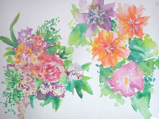 For the watercoloured florals I've used Windsor & Newton's watercolour paints with Derwent's Inktense pastels which work great together. The Inktense Pastels are my new discovery. They are watercolour pastels which you can use in a few different ways. I like to draw with them and then paint water over to soften, you can also paint water onto paper first and draw over which is also a nice effect as the pastel bleeds into the water. You can also shave off specks of the pastel onto your paper and then paint over for a more intense watercolour look.